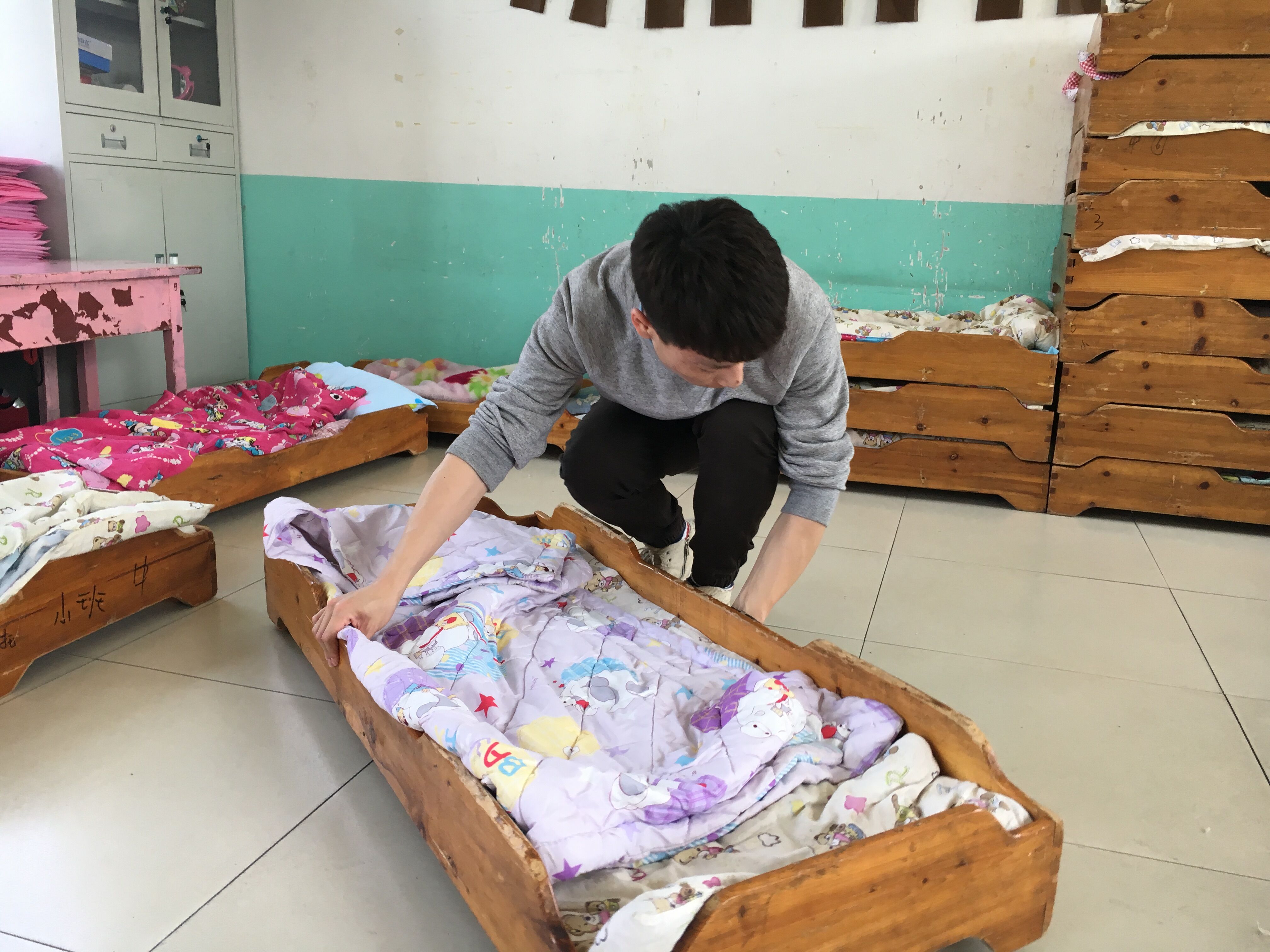 13点45分,志愿者一同抵达后魏村幼儿园。小朋友们还在午休,志愿者们与园长一起讨论了关于庆祝六一儿童节的前期准备工作的问题,大家纷纷提出了精彩的创意。不一会儿,小朋友们陆陆续续开始起床,志愿者和幼儿园老师一起为小朋友整理床铺,打扫卫生。个别小朋友不愿起床的淘气模样让志愿者哭笑不得。整理完毕,志愿者给小朋友分发了准备好的水果和水杯,孩子们脸上纯真满足的笑容让志愿者十分欣慰与难忘。当小朋友在室外做游戏时,志愿者和老师一起安装了新的床具,为他们准备了一大惊喜。最后,伴随着正在做游戏的孩子们的欢声笑语,志愿者和老师说了再见,结束了本次志愿者活动。