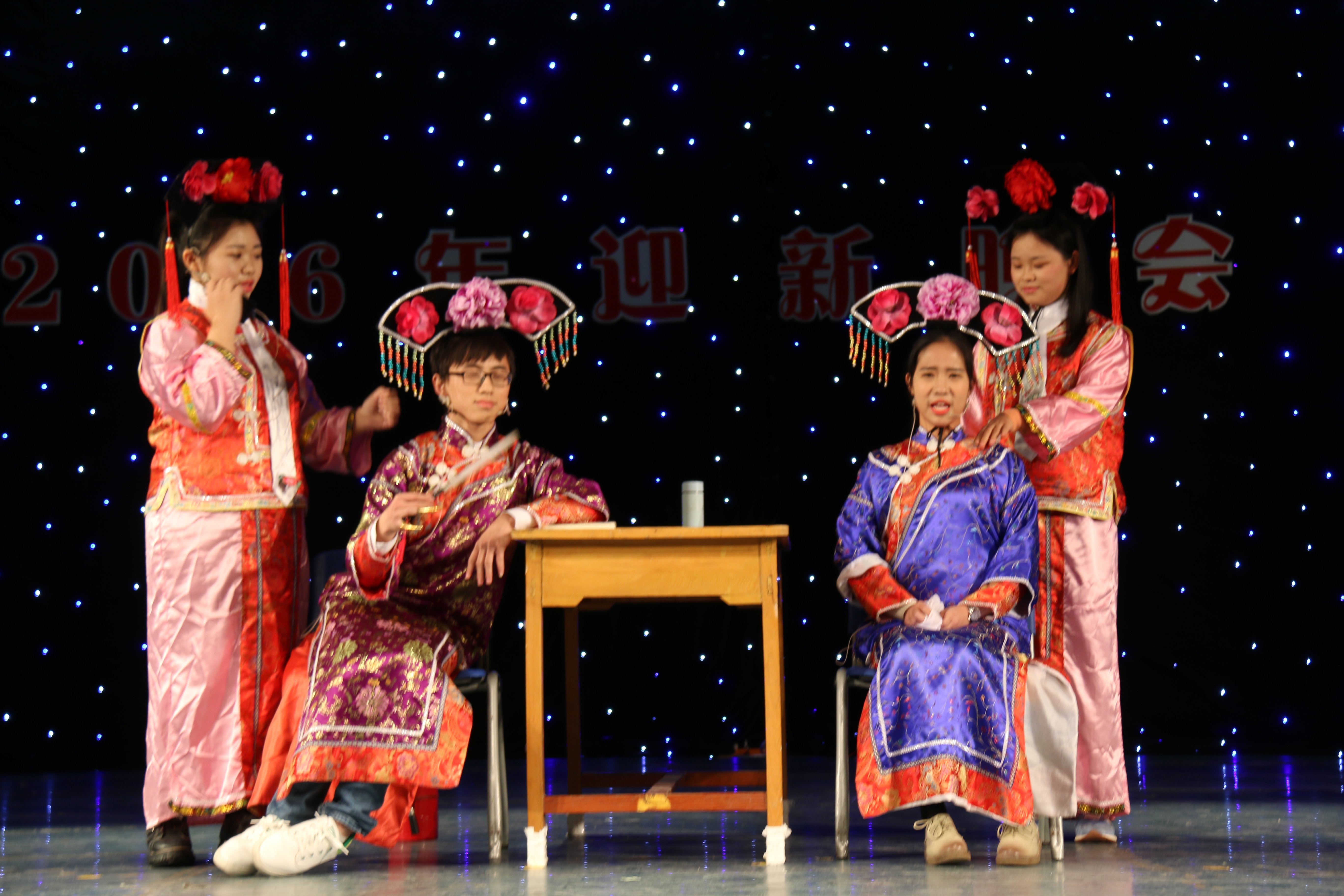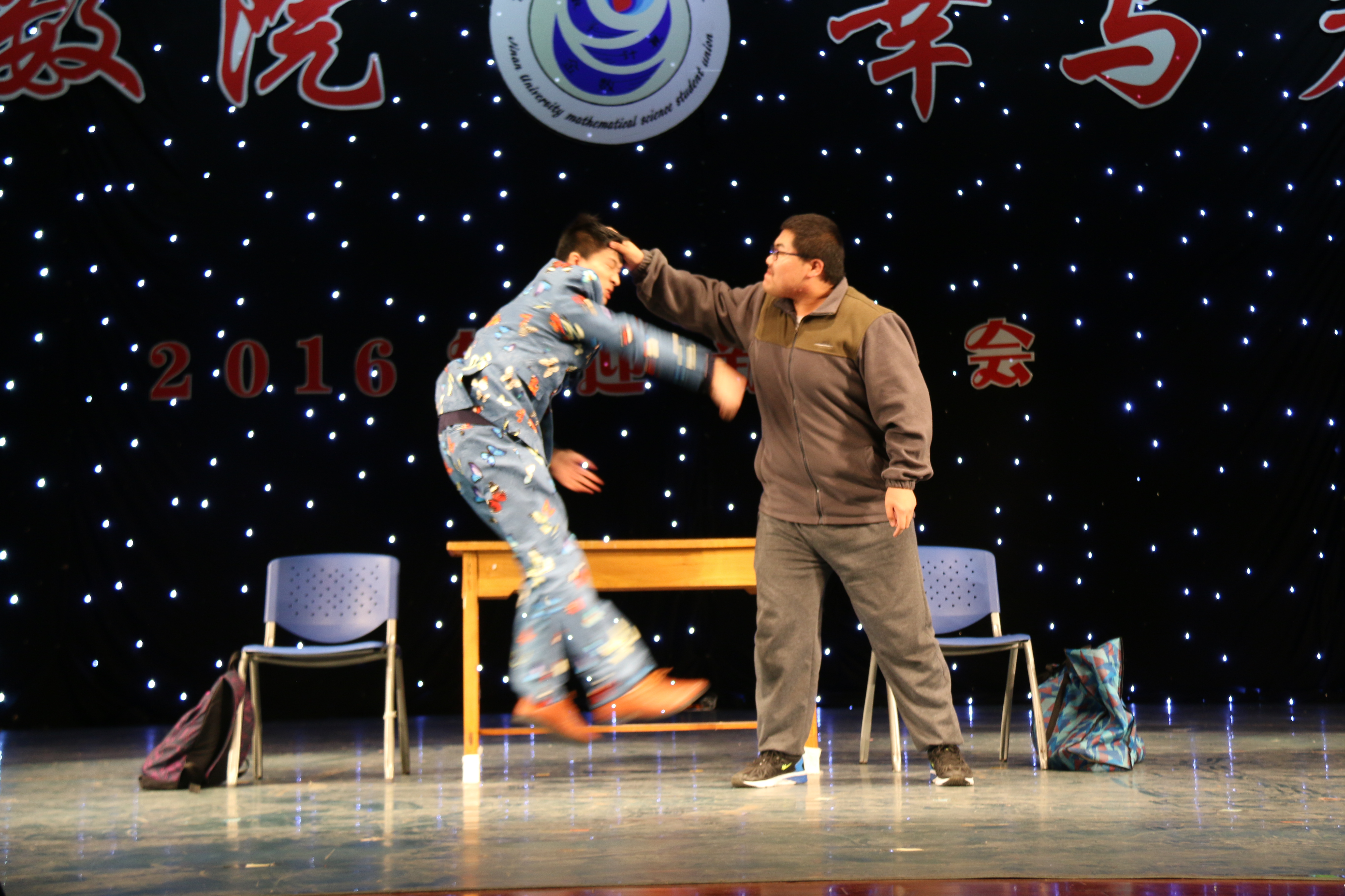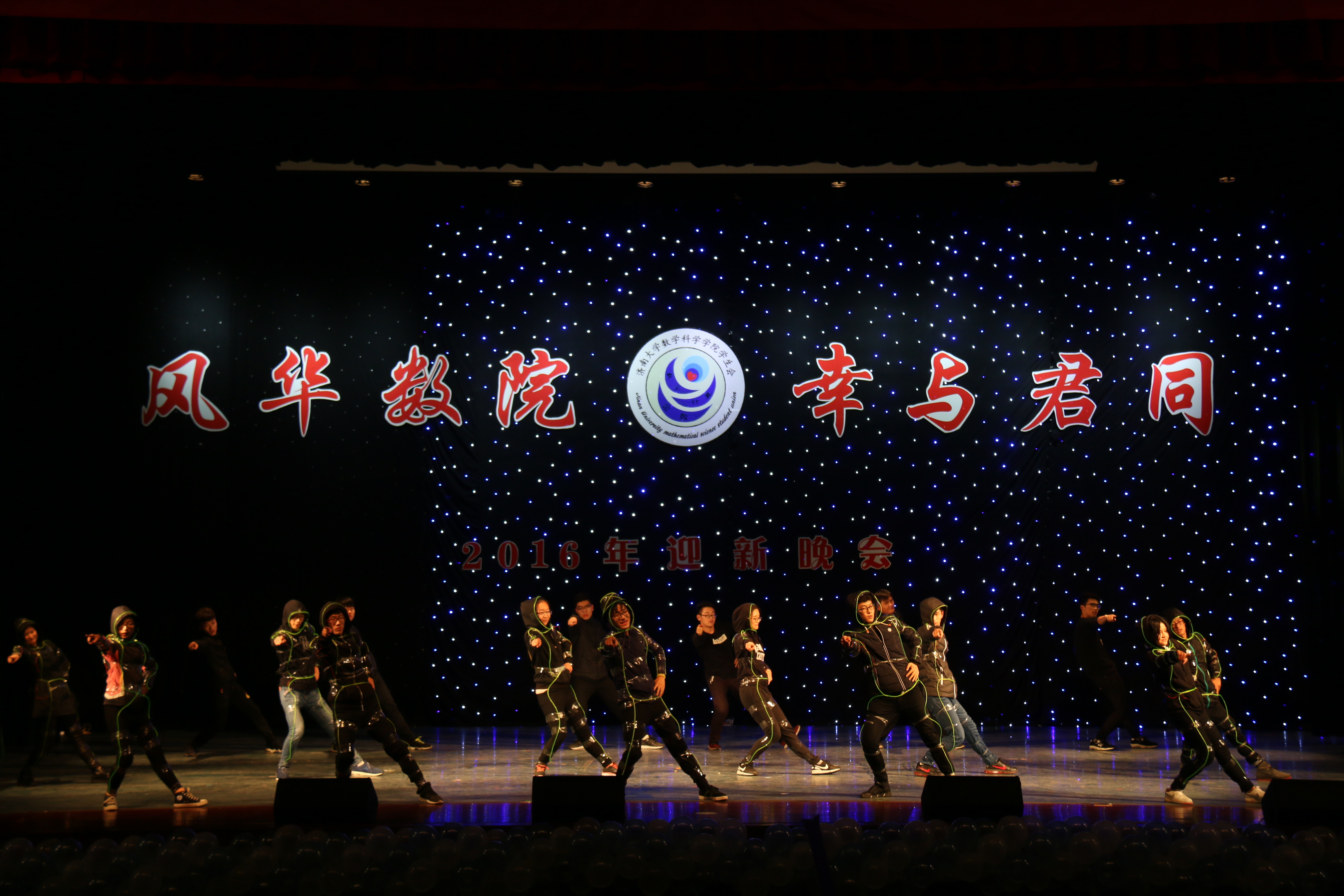 晚会在火热的开场舞中拉开帷幕,全场观众迅速融入晚会热烈的气氛中,与微信墙的实时点播相互促动。歌曲和舞蹈串烧分别唱出梦想、舞动青春。小品《数院甄嬛传》结合学院专业特色,把数学各学科用诙谐的语言在舞台表现出来,以角色大反串的形式上演了一场别开生面的爆笑后宫大戏。哑剧《你有我也有》以夸张的表演和精彩的配合让现场观众笑不拢嘴。创意节目《黑夜精灵》以及《手套荧光舞》,其精美造型,凭借动感的舞蹈节奏在黑暗中展现了一场精彩绝伦的光影景象。一时间晚会现场群情激昂,掌声雷动,气氛一次次达到高潮。同时与西藏中学的小朋友们一起现场表演的《藏汉一家亲》,给观众带来了少数民族舞蹈的美妙体验。晚会上,辅导员赵华磊老师与学生的倾情朗诵,诉说“我”的济大情,打动着每一位济大学子……这些精彩纷呈的节目给观众带来了一场无与伦比的视听盛宴,充分展现了数院学生多才多艺、自信昂扬的精神风貌。