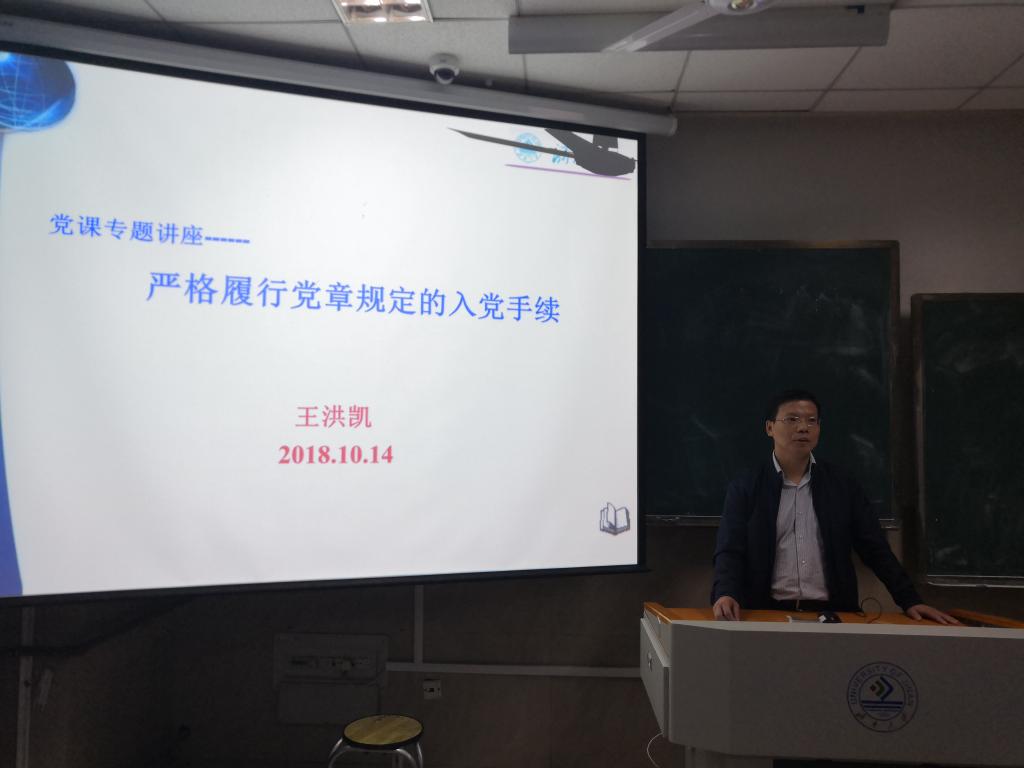 为了明确党的规定和入党条件,规范入党积极分子的行为习惯,提升党性修养,10月14日晚上七点,kaiyun云开登录入口在1教207举行了以“严格履行党章规定的入党手续”为主题的党课培训。本次党课由kaiyun云开登录入口副院长王洪凯担任主讲,44名入党积极分子积极参与。