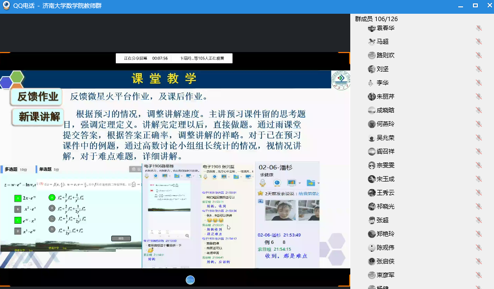 会上,张苏梅、苗丽安、吕洪波、李西成、权培英、刘春燕、王涛等7位老师先后发言,从授课软件选择和使用、课前预习发布和监督、课堂气氛营造和调动、课后作业批改及答疑、师生网上互动和交流等多个方面分享了各自心得体会,并就授课过程中遇到的问题和困难进行了深入研究。老师们一致认为,线上授课相较于线下授课更能考验教师的责任心和自信心,是对教师的责任心、教学能力和水平的实战检验。对线上授课体验,老师们普遍感觉,“还是挺幸福的,学生们非常配合,感觉非常舒畅”,纷纷表示在接下来的授课过程中将积极吸取优秀经验,力争做到“尽管跟学生的空间不在一起,但是要跟学生学习的心在一起,让他们感受到老师的陪伴”。