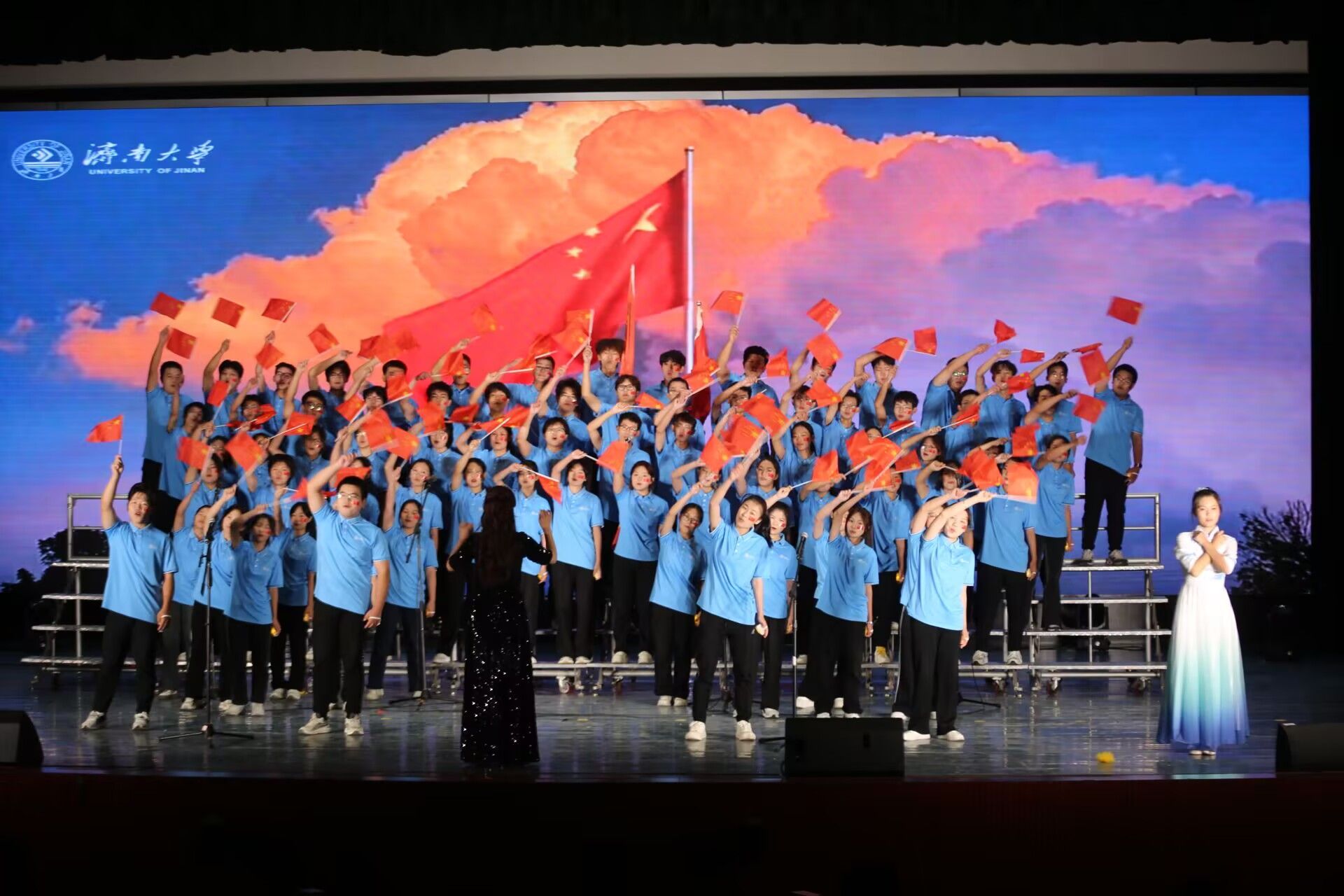 当队员们踏上舞台,璀璨的灯光洒落在他们身上,数院学子们光芒四射,彰显青春活力。伴随着指挥棒轻轻挥下,激昂的音乐奏响,优美的旋律与和谐的和声在空气中悠然回荡,合唱队员们用那充满力量的歌声传递爱国力量与希望之光。校歌《与我同行》,充分展现了同学们对母校的赞美与深深归属感;《强国一代有我在》则如同激昂的战歌,深切表达了同学们对民族复兴以及奋进新征程、追逐新梦想的美好祝福。数院学子们用深情的歌声,唱出了对祖国的诚挚祝福,唱响了强国复兴的时代强音。
