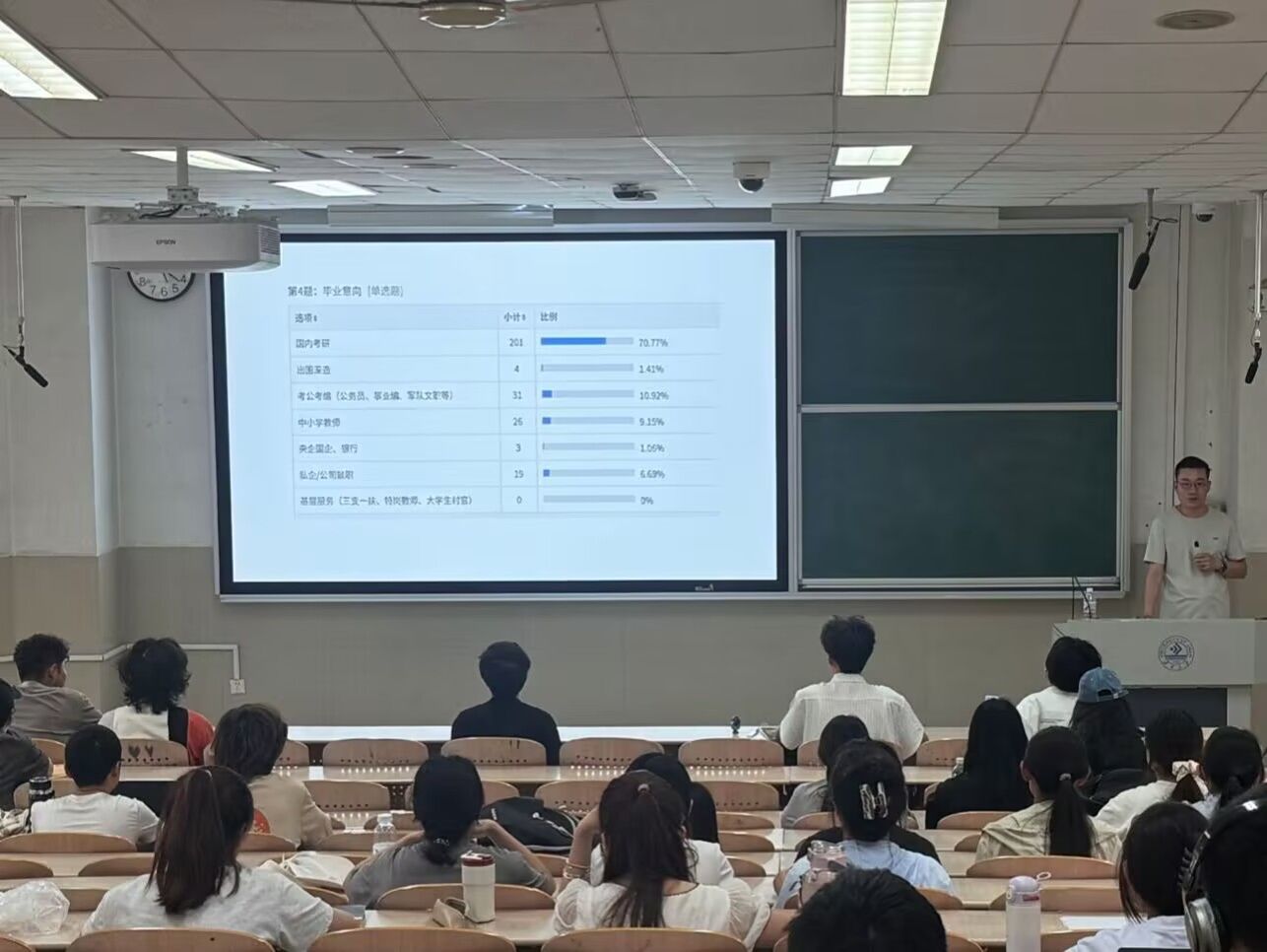 会议对年级整体毕业意向进行全面分析,并针对学生在生涯规划中面临的困惑,结合研招网、国家公务员局等官方平台信息,详细介绍考研、考公、就业等不同发展路径的准备要点。李宁通过展示上届考研数据及当前同学们的目标院校,提醒学生“抬头看天,也要低头看路”,扎实基础专业知识,切记好高骛远。同时,针对学生反馈的“缺乏实习或项目经验”“专业能力不足”等主要就业困难,他建议学生积极参与“青鸟计划”返家乡社会实践等活动,提升自身综合实力,打破信息壁垒,从容应对目标岗位竞争。