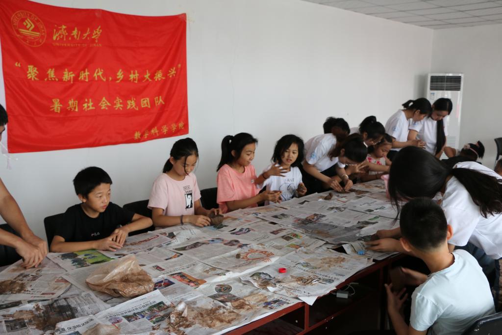 除了必要的知识技能以外,孩子们的动手能力也不可或缺。上午9点,志愿者们给孩子们上了一堂生动有趣的泥塑课。课堂上,志愿者和孩子们一起和泥巴,发动奇思妙想,一起完成优秀的泥塑作品。课程结束后,孩子们将各种各样的泥塑在桌子上摆满,有水杯、茶壶、章鱼等,各个生动形象,惟妙惟肖。最后,孩子们与志愿者们交换各自的作品留念,每个人的脸上都挂着最为可爱的笑容。下午,村第一书记张魁帅带领志愿者们来到黄河大坝,村主任为志愿者们讲解大坝的杨庄险工项目,志愿者们也领略到母亲河的雄伟壮丽。不知不觉,一天过去了,志愿者们再次依依不舍的离开了杨家庄。