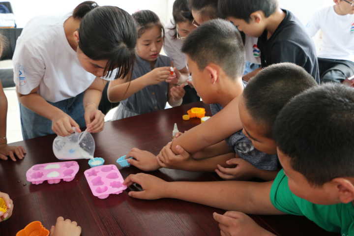 今天,志愿者给孩子们带来了有趣而又实用的手工课——制作手工皂。首先,志愿者给孩子们讲解了制作手工皂的详细步骤,然后让孩子们选择自己喜欢的模具。因肥皂的制作对孩子们来说比较困难,志愿者也加入其中,与孩子们一起制作,从搅拌皂液、添加香味色素到最后凝固成型,每一个步骤都充满着欢声笑语。看到大家齐心协力制作的肥皂的成品,志愿者和孩子们都十分满意。