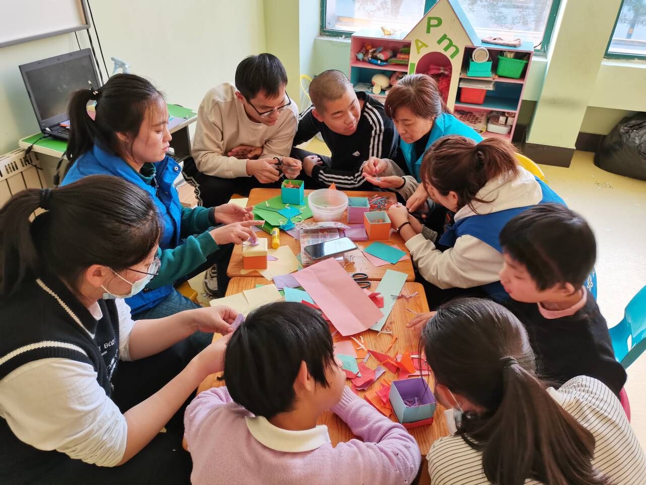 下午一点,志愿者们准时到达天翼儿童训练中心,康复中心的老师对志愿者的到来表示热烈欢迎。随后,康复中心的工作人员对志愿者进行了培训,详细介绍了每个孩子的状况。安排妥当后,志愿者和孩子们先看了半小时的动画片,相互了解后,志愿者和孩子们做起了剪纸游戏,帮助他们做了一张张感恩父母的贺卡,刚开始孩子们还很害羞,经过志愿者们耐心的辅导,孩子们渐渐敞开心扉,欢笑声遍布教室的每个角落,老师们也露出了欣慰的笑容,孩子们快乐的享受着游戏,这一刻他们与正常孩子一样,无忧无虑的过着童年生活。最后,活动在温馨的氛围中结束,看着孩子们依依不舍的眼神,志愿者们感到付出得到了回报,纷纷表示要坚定将爱心传播下去。