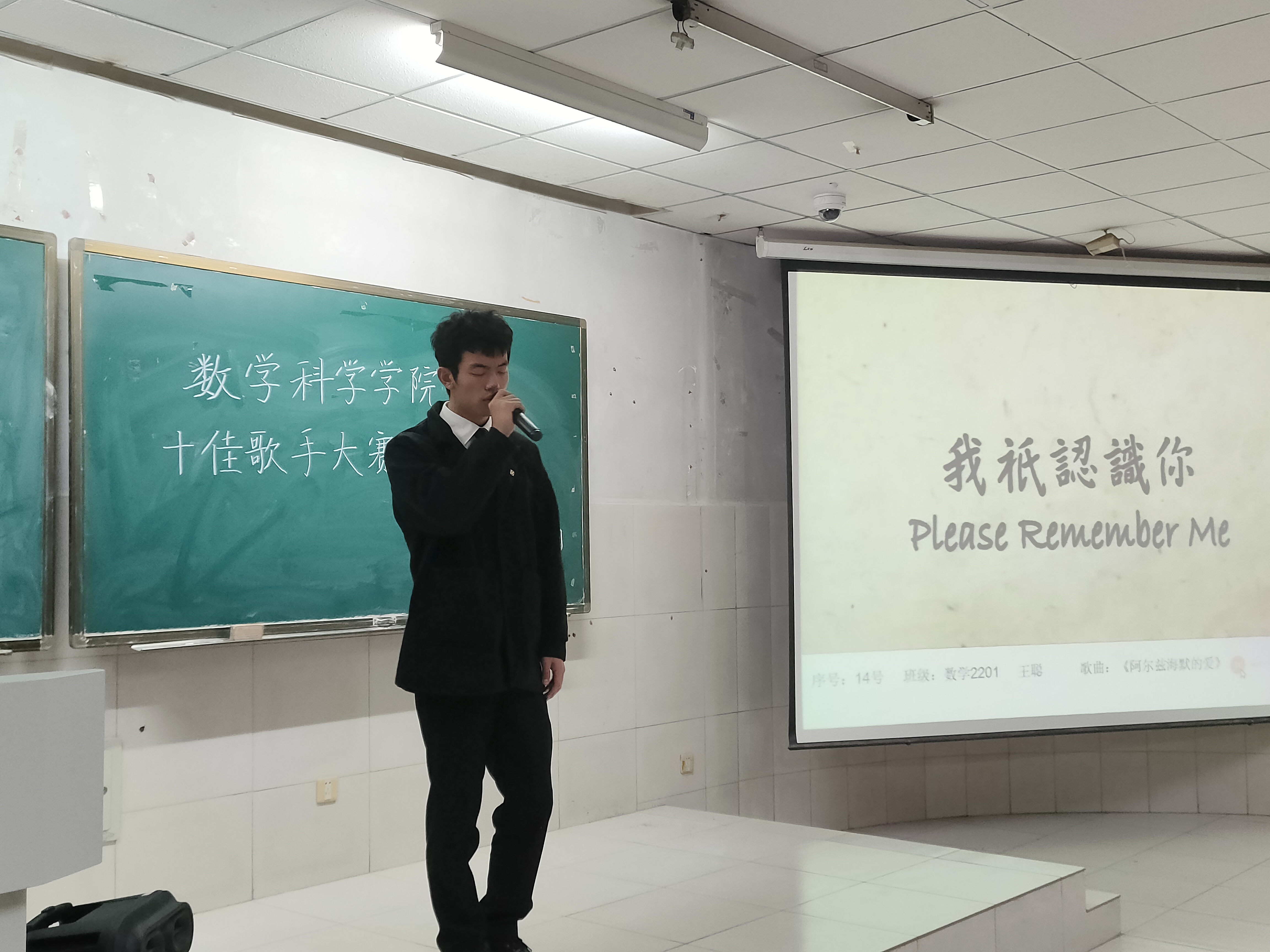 紧张而又简短的开幕致词过后,本次比赛正式开始。怀揣着激情与梦想,选手们一上台便让在场的所有人感受到他们展现才华的渴望和洋溢青春的热情。或温柔深情的嗓音,或激情澎湃的演唱,观众们听的如痴如醉,掌声和喝彩声经久不息。其中,数科2202班的唐露瑶同学以一首经典的歌曲《我们的爱》引起现场阵阵热烈的掌声;数科2202刘玉泉同学独唱的《不染》,用独特的嗓音唱出了一生无悔的潇洒,现场的气氛被带动的愈发高涨起来;来自数学2201班的王聪同学浅吟低唱的一首《阿尔茨海默的爱》凭借着细腻的歌词,满含真情的演唱让观众们深入其境,泪水涟涟。最终,在众人的期待中,王聪同学以8.783的高分成为了本次海选比赛的第一名。伴随着同学们的欢呼声,比赛落下了帷幕。
