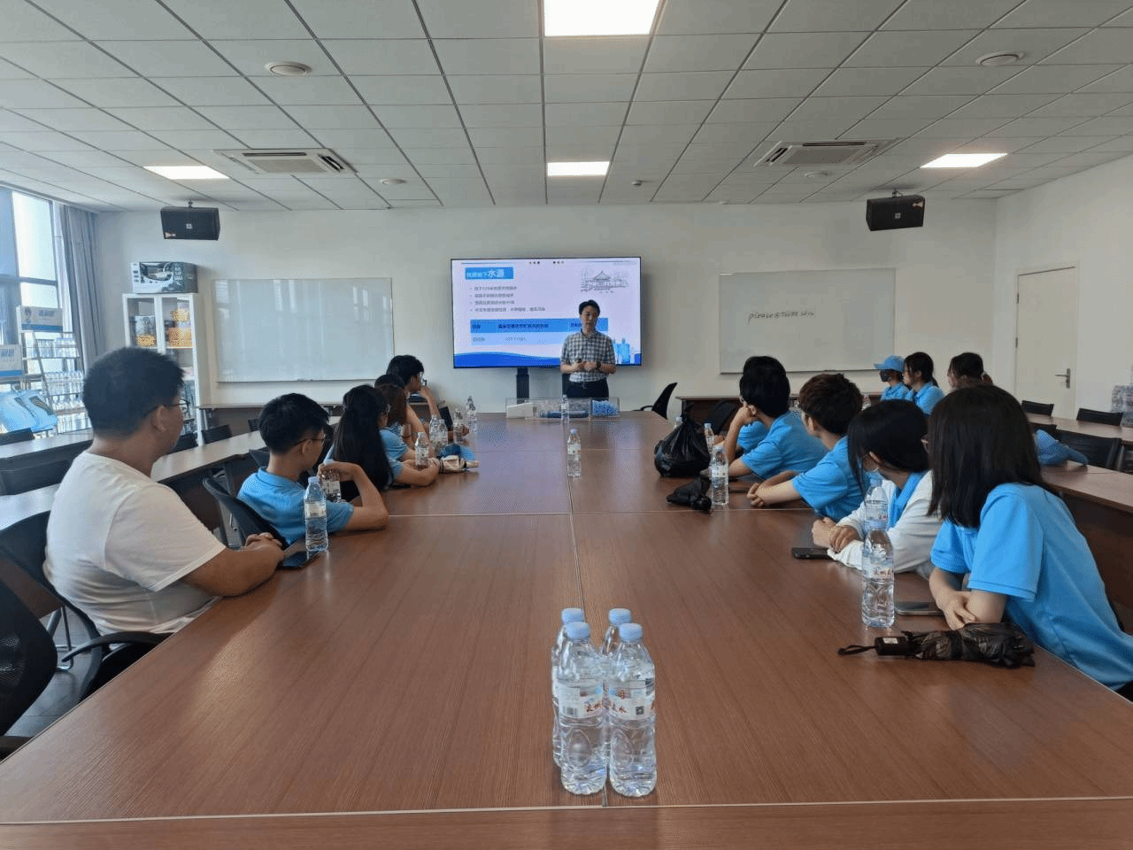 在公司多名工作人员的带领下,实践队进入普利斯高新工厂的生产车间近距离地观看了济南泉水净化罐装的过程,并在工厂专业人士的讲解带领下,成员们了解到了一瓶水从采水、过滤、吹贴灌旋,到检测、码垛,最后膜包、入库等一整套无人无菌化的生产流程。生产线采用了无人自动化技术,实现无菌操作生产,使用双层不锈钢无缝管成井,水质稳定无污染,让产品品质有充分的安全保障。工厂相关技术专业人员向成员们全方面展示介绍了瓶装、桶装水的净化和分装过程。随后,实践队来到会议室,行政工作人员为成员们讲解了瓶身、瓶盖以及桶的生产原材料,并详细介绍了工厂的基本情况及工作成效。实践队也看到了普利斯高新工厂作为一家自主发展自主创新企业的专业实力和发展潜力。